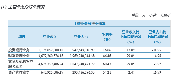 其中,交易及机构客户服务业务、财富管理业务今年上半年的营业收入同比增幅最高,均达到29.05%,营业收入分别实现46.74亿元、36.79亿元。